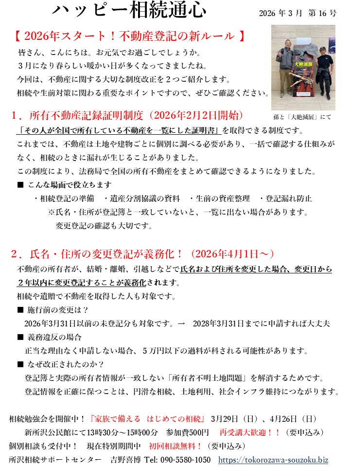 今回は、2026年にスタートする相続登記の新ルールについて2件お知らせしています。
